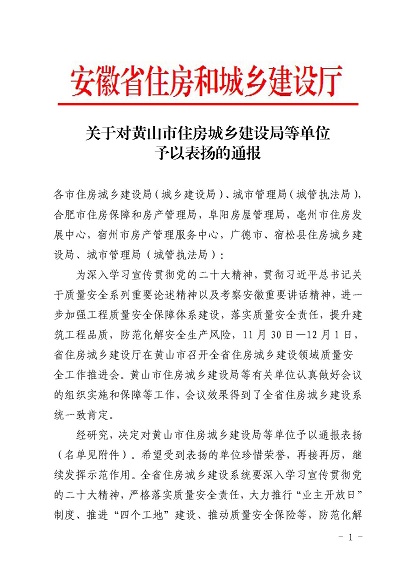 近日,安徽省住房和城鄉(xiāng)建設(shè)廳印發(fā)《關(guān)于對黃山市住房和城鄉(xiāng)建設(shè)局等單位予以表揚的通報》,《通報》指出,11月30日-12月1日,省住房和城鄉(xiāng)建設(shè)廳在黃山市召開全省住房建設(shè)領(lǐng)域質(zhì)量安全工作推進會,會議效果得到全省住房城鄉(xiāng)建設(shè)系統(tǒng)一致肯定,并對在此次會議認真做好組織實施和保障的單位予以通報表揚,黃山市建工集團股份有限公司作為唯一一家本土建筑施工企業(yè)榮獲表揚。
