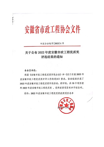 根據(jù)《安徽市政工程優(yōu)質(zhì)獎(jiǎng)評選辦法》和《關(guān)于開展2022年度安徽市政工程優(yōu)質(zhì)獎(jiǎng)評審工作的通知》要求,安徽省市政工程協(xié)會(huì)組織開展了2022年度安徽市政工程優(yōu)質(zhì)獎(jiǎng)評選活動(dòng)。黃山市建工集團(tuán)股份有限公司承建的黟縣五里轉(zhuǎn)盤至開發(fā)區(qū)段道路及雨污管網(wǎng)升級改造項(xiàng)目榮獲2022年度安徽市政工程優(yōu)質(zhì)獎(jiǎng)。