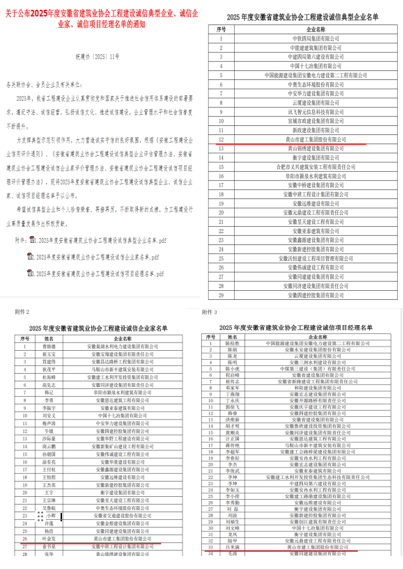 近日,國家及省級行業(yè)協(xié)會相繼公布關(guān)于2025年度工程建設(shè)領(lǐng)域系列信用評價(jià)與先進(jìn)評選的結(jié)果,黃山市建工集團(tuán)股份有限公司憑借卓越的綜合實(shí)力、良好的市場信譽(yù)和穩(wěn)健的經(jīng)營表現(xiàn),在多個(gè)權(quán)威評選中脫穎而出,收獲累累碩果,再次彰顯了公司在行業(yè)內(nèi)的領(lǐng)先地位與誠信標(biāo)桿形象。